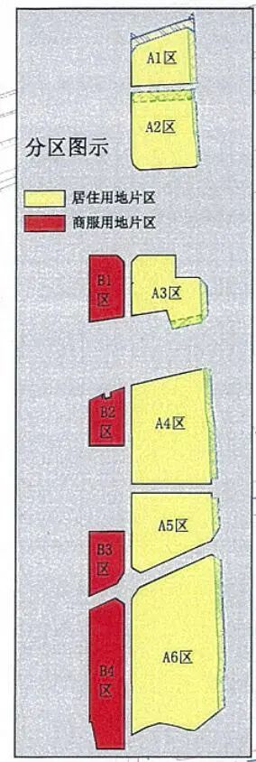 其中,A1-A6区为二类居住用地兼容商业用地,容积率在2.5-2.97之间,限高80米,B1-B4区为商业用地,容积率介于5.1-6之间,限高介于80-120米之间。宗地要求开发投资总额不低于人民币145266万元。