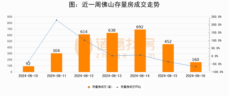 从存量房来看,2024年06月16日佛山存量房单日成交160套,比昨日减少292套,环比下降64.6%。从近一周存量房成交来看,佛山存量房日均成交套数为421套,06月16日单日成交160套,低于近一周平均水平62%。