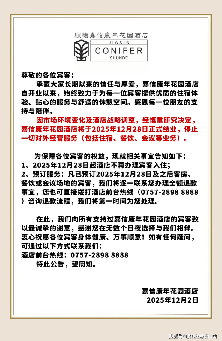 近日,顺德嘉信康年花园酒店发出公告,因市场环境变化及酒店战略调整,经慎重研究决定嘉信康年花园酒店将于2025年12月28日正式结业,停止切对外经营服务(包括住宿、餐饮、会议等业务)。