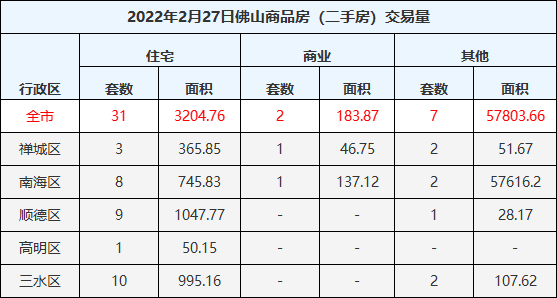 二手住宅成交31套,成交面积3204.76㎡,禅城3套,南海区8套,顺德区9套,高明区1套,三水区10套。