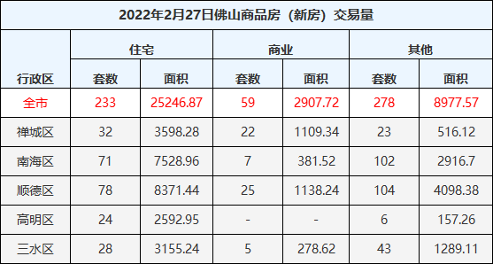 2月27日佛山五区一手房网签233套,二手房网签31套