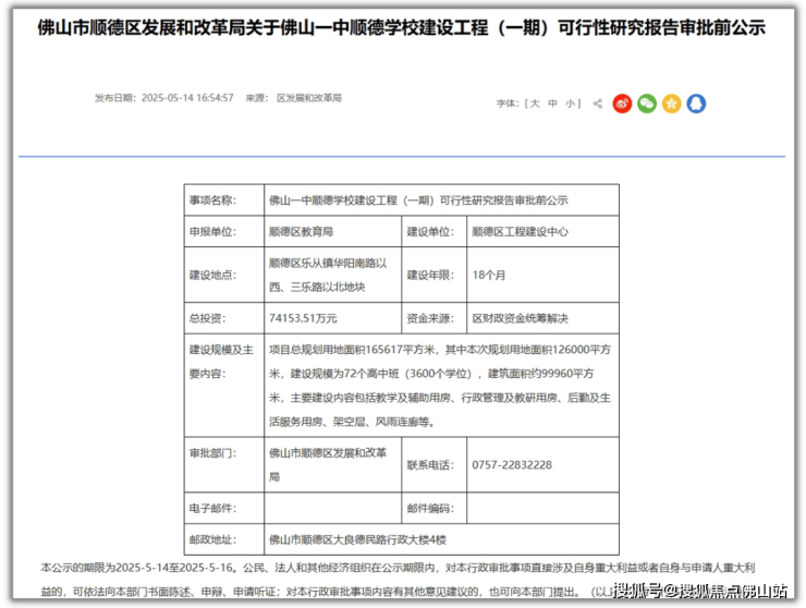 此前,佛山一中顺德学校建设工程(一期)可行性研究报告审批前公示,这也预示着离动工又进一步。