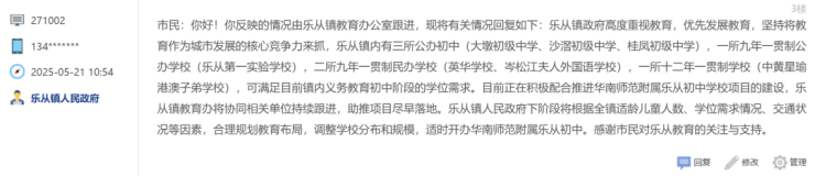 此前,乐从镇人民政府曾表示:“目前正在积极配合推进华南师范附属乐从初中学校项目的建设,乐从镇教育办将协同相关单位持续跟进,助推项目尽早落地。乐从镇人民政府下阶段将根据全镇适龄儿童人数、学位需求情况、交通状况等因素,合理规划教育布局,调整学校分布和规模,适时开办华南师范附属乐从初中。”