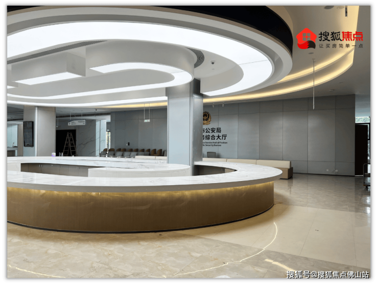 从现场来看,环形服务岛台、灯带、天花板吊顶等已安装好,墙上还贴上了“佛山市公安局综合大厅”的字眼。