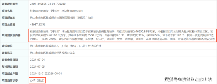 8月6日,广东省投资项目在线审批监管平台更新了有关桂澜路西侧地段“洲尾坦”地块教育用地项目的信息。