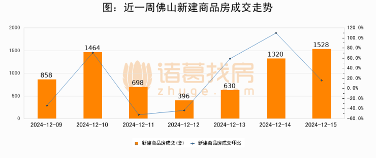 根据佛山市住房保障和房产信息网数据显示,2024年12月15日佛山新建商品房成交1528套,较昨日增加208套,环比上涨15.8%