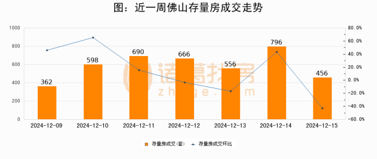 从存量房来看,2024年12月15日佛山存量房单日成交456套,比昨日减少340套,环比下降42.7%。从近一周存量房成交来看,佛山存量房日均成交套数为589套,12月15日单日成交456套,低于近一周平均水平22.6%。