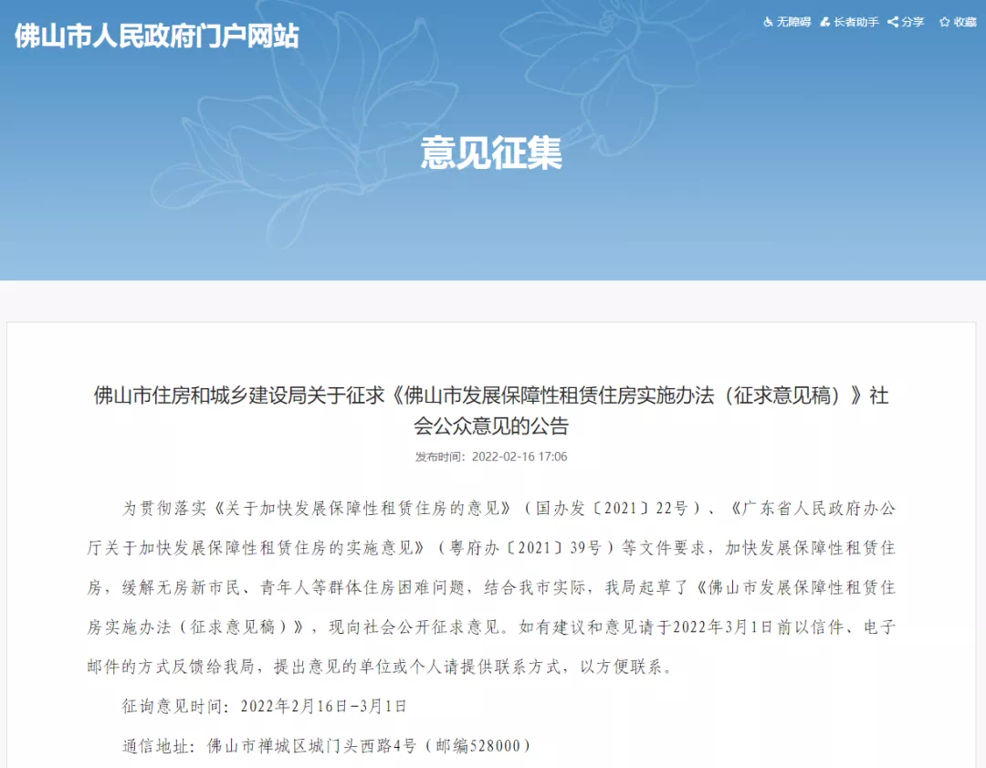 近日,佛山市住房和城乡建设局发布《佛山市发展保障性租赁住房实施办法(征求意见稿)》。