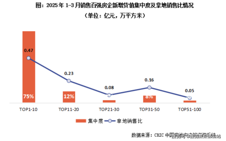 每经记者注意到,在房企拿地金额增长的同时,行业集中度也在持续走高。克而瑞监测显示,今年一季度,销售百强房企中,TOP10房企新增货值占比为75%,较2024年末增加13个百分点;TOP11—20房企、TOP21—30房企、TOP31—50房企和TOP51—100房企的新增货值占比分别为13%、3%、10%和3%。“未来市场格局进一步集中于头部企业。”