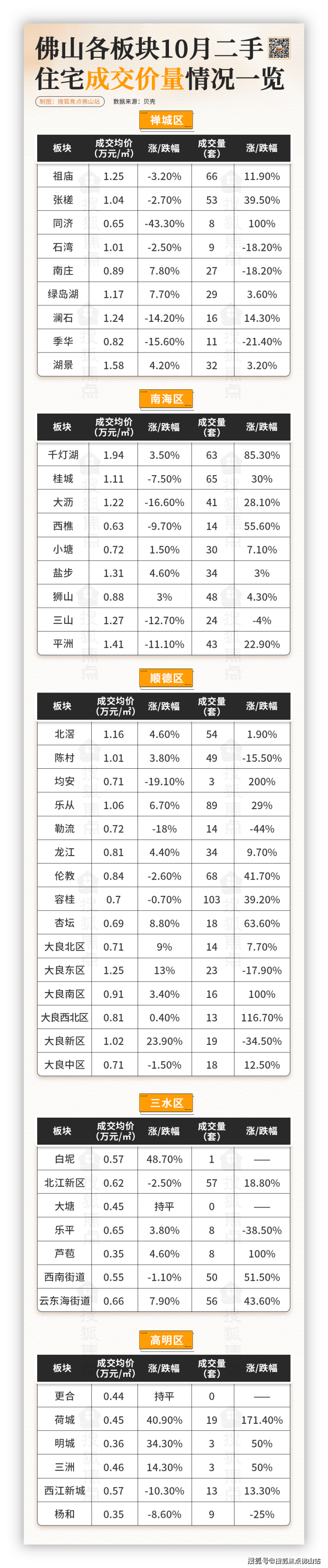 价量齐跌的板块有石湾、季华、三山、里水、勒流、杨和,集中在禅城和南海。