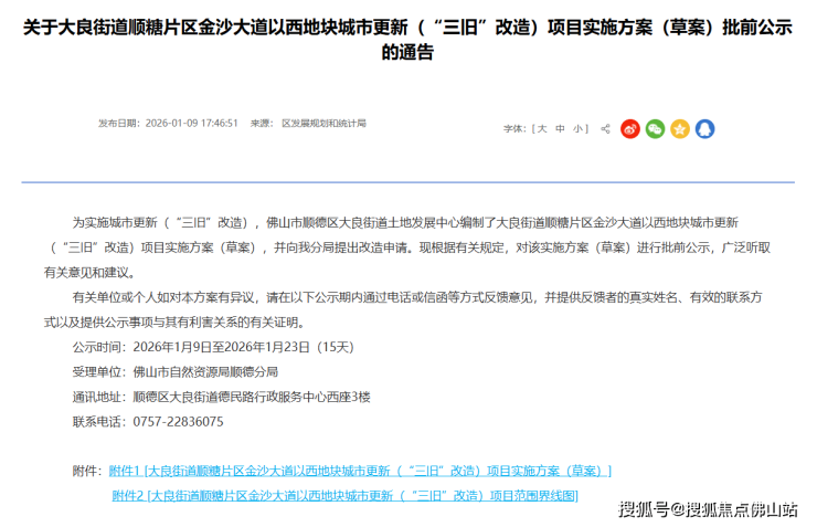 公告显示,为实施城市更新(“三旧”改造),佛山市顺德区大良街道土地发展中心编制了大良街道顺糖片区金沙大道以西地块城市更新(“三旧”改造)项目实施方案(草案),并向我分局提出改造申请。