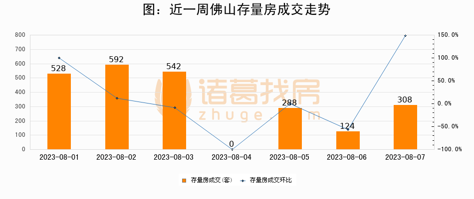 从存量房来看,2023年08月07日佛山存量房单日成交308套,比昨日增加184套,环比上涨148.4%。从近一周存量房成交来看,佛山存量房日均成交套数为340套,08月07日单日成交308套,低于近一周平均水平9.4%。