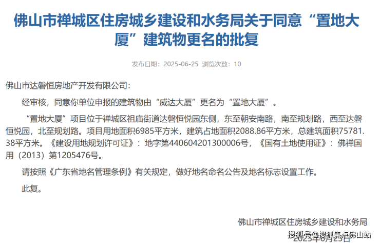 近日,禅城区住建局发布关于同意“置地大厦”建筑物更名的批复。