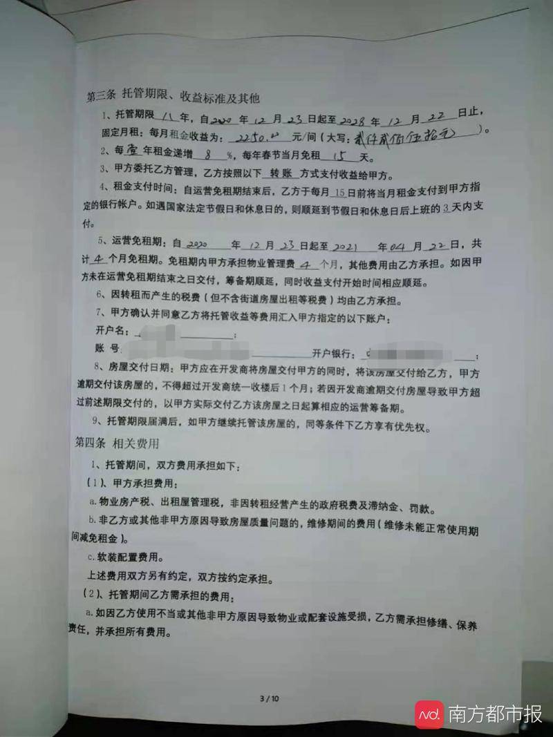 郑女士称,最初购买公寓时,销售推荐的公寓品牌为一呆公寓,称可以满足业主“一站式托管”,她也跟开发商签订了托管服务说明。而到了今年1月收楼时,销售给她推荐的变成另一家名为“维福顿”的品牌公寓,经营公司为广州雅典精品酒店管理有限公司。因租金满意,郑女士最终与该公司签订房屋委托管理合同,约定租期为8年,前4个月免租,酒店管理公司每月需向她返租2250元。为此,她还需缴纳了39800元的装修费用给该公司。