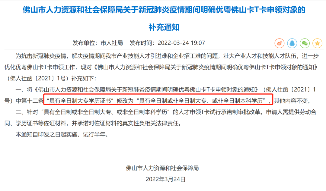 一、将《佛山市人力资源和社会保障局关于新冠肺炎疫情期间明确优粤佛山卡T卡申领对象的通知》(佛人社函〔2021〕1号)中第十二条“具有全日制大专学历证书”修改为“具有全日制或非全日制大专、或非全日制本科学历”,其他内容不变。