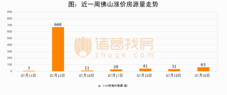 根据诸葛找房数据显示,佛山24小时涨价房源量为63套,较07月19日增加32套,环比上涨103.2%。与此同时,涨价房源占比小幅扩大,业主信心有所提升。