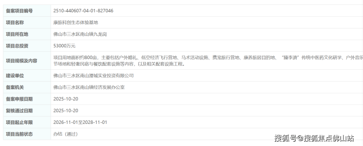 广东省投资项目在线审批监管平台显示,康旅科创生态体验基地通过备案。备案信息显示,项目位于佛山市三水区南山镇九龙岗,总投资5.3亿。该项目用地面积约800亩,主要包括户外婚礼、低空经济飞行营地、马术活动设施、携…