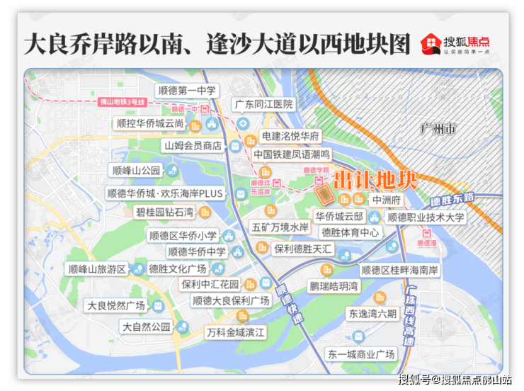 此次出让的大良地块,位于乔岸路以南、逢沙大道以西,紧邻佛山地铁3号线顺德学院站。