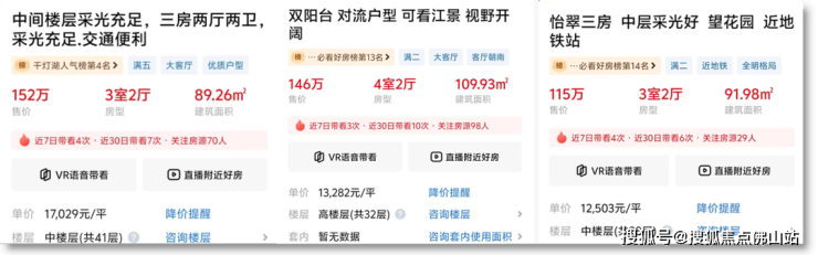 如 万科金域中央一套89㎡南向三房,挂牌单价1.7万/㎡ ;龙光玖龙湾一套109㎡高层精装房源,挂牌单价1.3万/㎡; 怡翠晋盛91㎡毛坯三房,挂牌单价1.2万/㎡ 等。