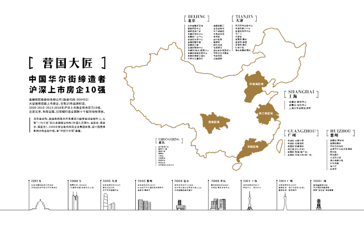 作为“中国华尔街缔造者”“中国沪深上市房企综合实力10强”,金融街控股自创立以来,已走过26个年头。金融街深耕五大城市群(京津冀、长三角、珠三角、成渝、长江中游)的中心城市,拓展环五大城市群中心城市(北京、天津、上海、苏州、广州、深圳、重庆、成都、武汉)一小时交通圈的卫星城/区域,服务通州副中心和雄安新区的国家战略,适时拓展海外市场。以开发销售业务和资产管理业务为双轮,以四大产品体系(商务产品、住宅产品、特色小镇产品、金融集产品)、四大服务体系(商务产品服务体系、住宅产品服务体系、特色小镇服务体系、金融集服务体系)为抓手,打造房地产全价值链业务平台。