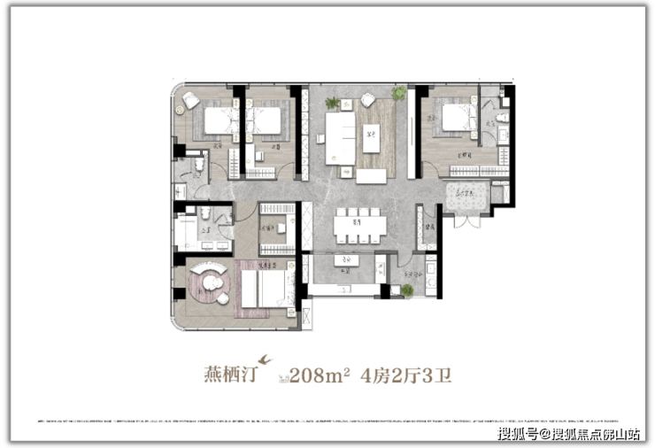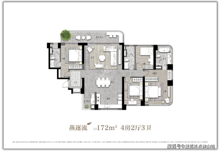 建面约172㎡四房两厅的户型,同样双套房设计,但生活阳台空间很小,类似小飘窗,与大阳台对流感不强。