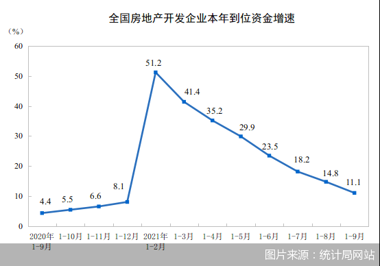 1-9月,房地产开发企业到位资金151486亿元,同比增长11.1%;比2019年1-9月增长16.0%,两年平均增长7.7%。其中,国内贷款18770亿元,同比下降8.4%;利用外资59亿元,同比下降36.9%;自筹资金47212亿元,同比增长6.1%;定金及预收款56689亿元,同比增长25.6%;个人按揭贷款24124亿元,同比增长10.7%。