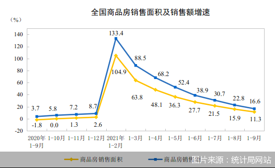 10月18日,国家统计局披露今年前9个月全国房地产开发和销售情况。数据显示,1-9月,全国商品房销售面积130332万平方米,同比增长11.3%,增速较上月收窄4.6个百分点;商品房销售额134795亿元,同比增长16.6%,增速收窄6.2个百分点。