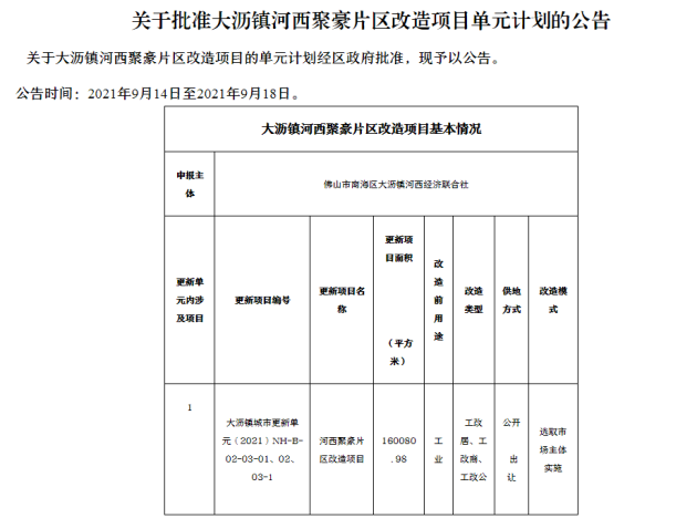 根据文件显示,大沥镇河西聚豪片区改造项目总占地160080.98㎡,改造类型为工改居、工改商、工改公,项目将通过公开出让的工地方式,通过选取市场主体实施。