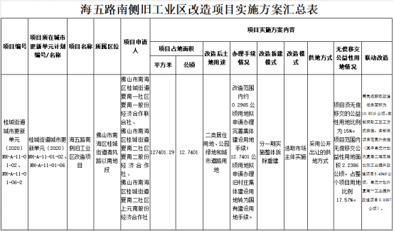 根据文件显示,海五路南侧工业区改造项目位于佛山市南海区桂城街道清风路以南地段,占地127401.29,合计12.7401公顷,项目申请人为南海区桂城街道夏南一社区夏南一股份经济合作联合社、夏南二社区夏南二股份经济合作社及夏南二社区上元南股份经济合作社,土地类型为二类居住用地、公园绿地和城市道路用地。