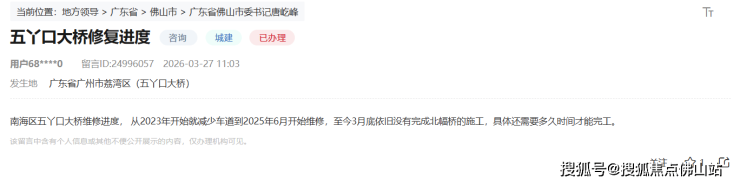 近日,有网友在领导留言板上咨询五丫口大桥修复进度,他表示:“南海区五丫口大桥维修进度, 从2023年开始就减少车道到2025年6月开始维修,至今3月底依旧没有完成北幅桥的施工,具体还需要多久时间才能完工。”