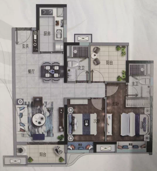 105㎡呈竖厅布局,两房两厅两卫设计,厨房内设有生活阳台,既增加了厨房的采光,也增加了收纳空间。