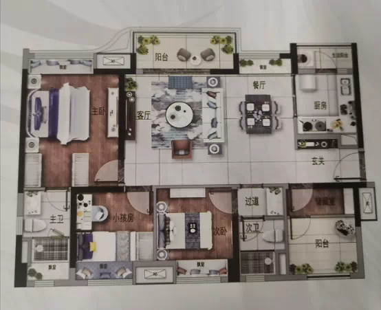 另外,该户型设有三阳台,其中一阳台可改装为书房或儿童房使用。