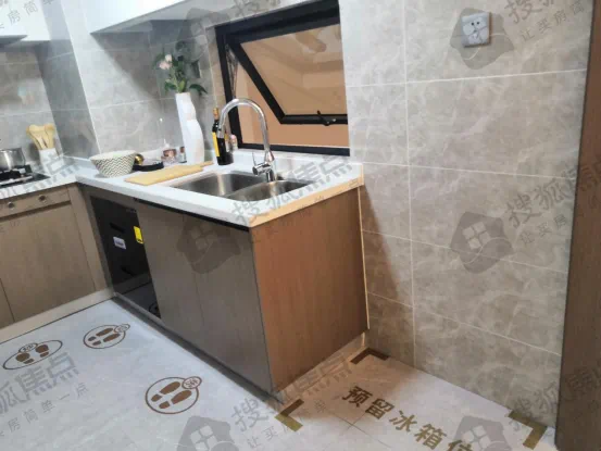 厨房呈U型流水线设计,预留了冰箱位置,据销售介绍,预留空间阔绰,可放双开门冰箱,但事实上,加上厨房门后,预计最多只能放单门冰箱。