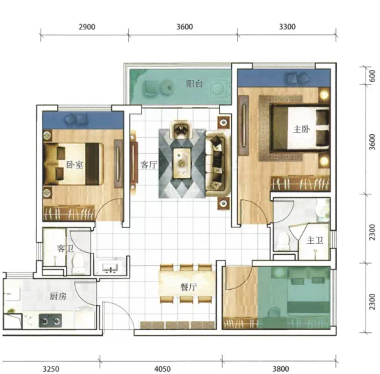 109㎡3+1房2厅2卫,采用横厅布局,采光充足,空间通透。