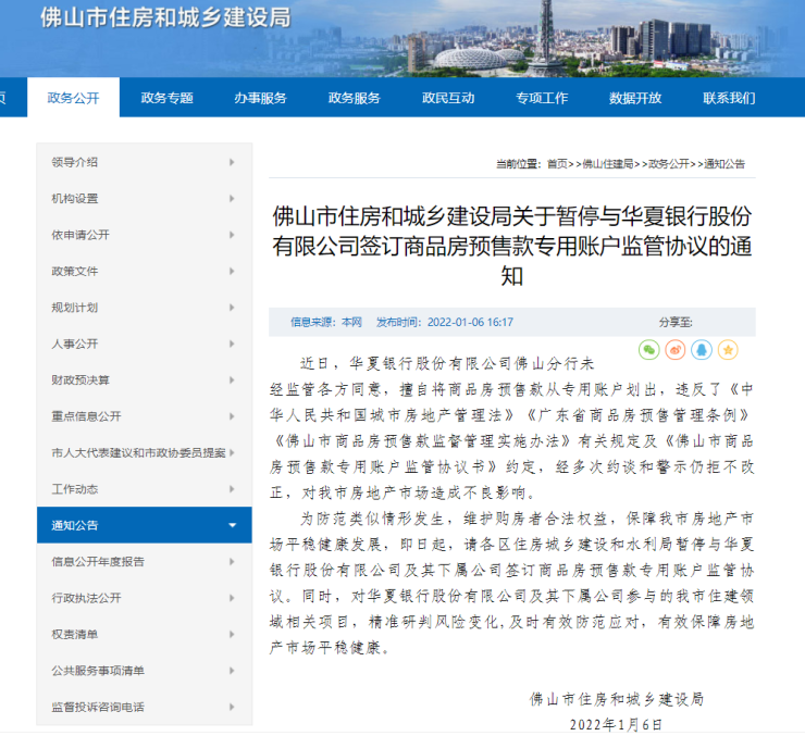 近日,佛山住建局发布了《佛山市住房和城乡建设局关于暂停与华夏银行股份有限公司签订商品房预售款专用账户监管协议的通知》。