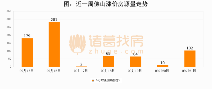 根据诸葛找房数据显示,佛山24小时涨价房源量为102套,较09月20日增加92套,环比上涨920%。与此同时,涨价房源占比小幅扩大,业主信心有所提升。