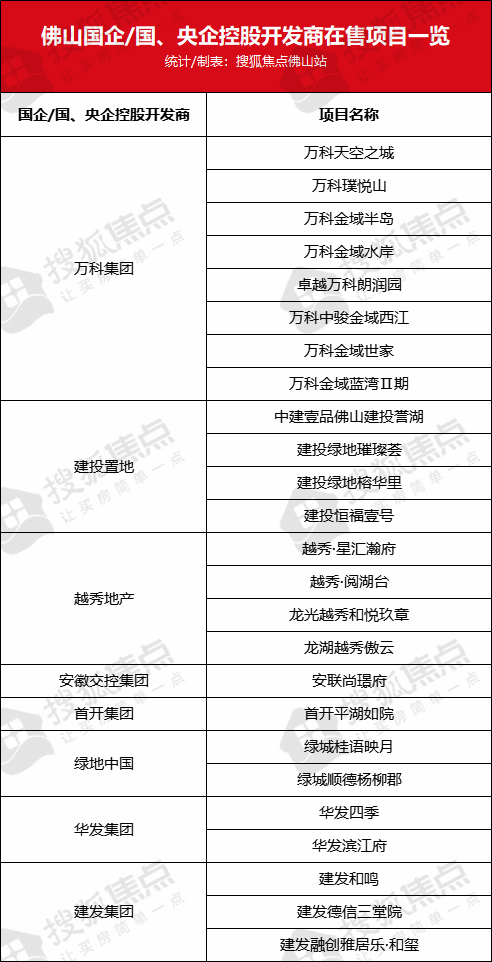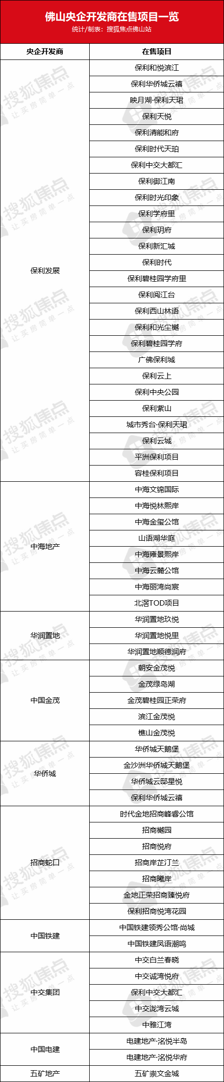此外,还有中海地产、华润置地、中国金茂、华侨城、招商蛇口等7个央企开发商,具体的佛山在售项目如下: