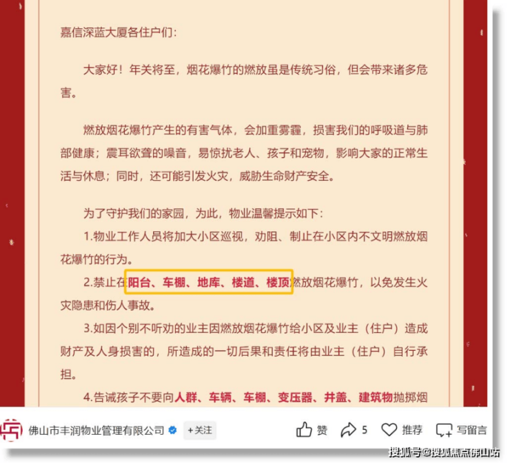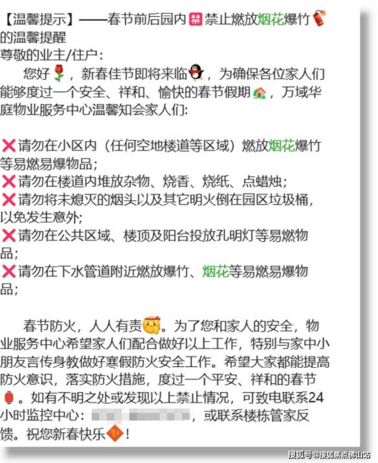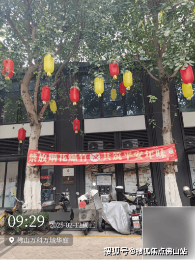 比如佛山万科万域华庭 ,醒目悬挂“ 禁放烟花爆竹” 提醒横幅。