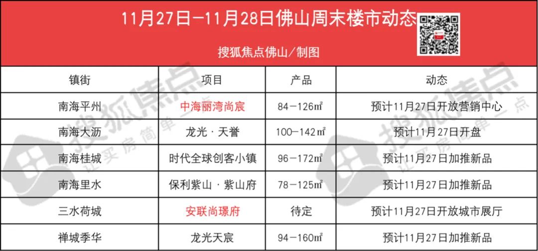 据小狐不完全统计,佛山楼市本周末(11月26-27日),至少有6盘有营销节点,其中中海丽湾尚宸11月27日开放营销中心。