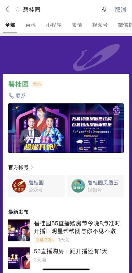 除作为日常营销入口外,“搜一搜”也是事件营销和交易的入口,用户可以在此方便地跳转至碧桂园官方视频号观看短视频和直播,或者跳转至“碧桂园凤凰云”微信小程序预约看房、下单买房。据了解,仅在5月5日当天,微信平台用户搜索碧桂园的次数就高达35万,点击次数超21.8万,整体点击率超62%,体现出良好的导流效果。