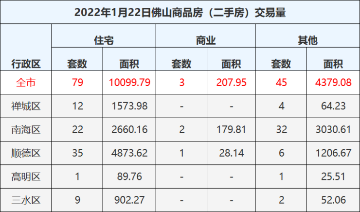 二手住宅成交79套,成交面积10099.79㎡,其中禅城12套,南海区22套,顺德区35套,高明区1套,三水区9套。
