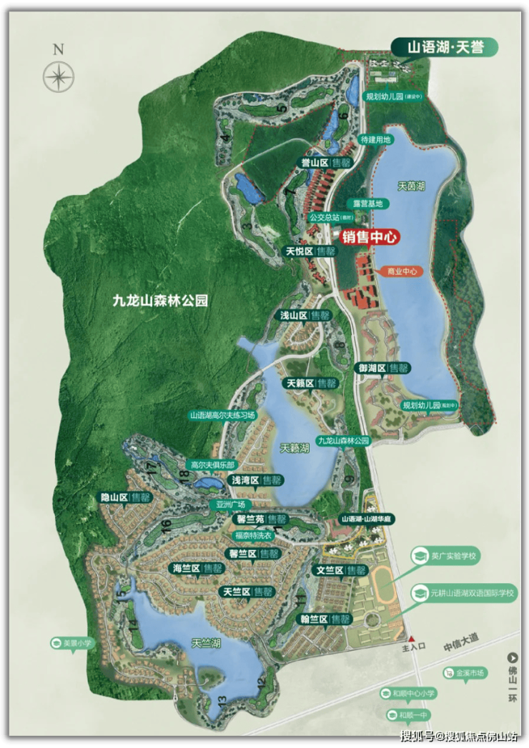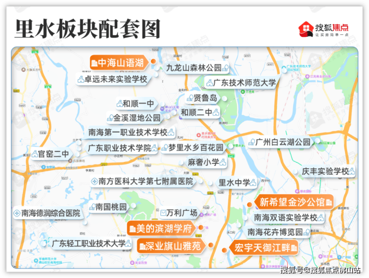 其中美的滨湖学府位于里水大道南与旗峰路交汇处,紧挨着旗峰小学,北侧有南海科学高中、嘉洲广场,东侧有旗峰中学,南侧为展旗生态公园。