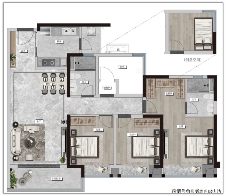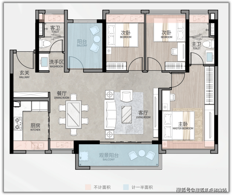 建面约117㎡四房,可以说是三房的放大版,主卧拥有独立衣帽间。