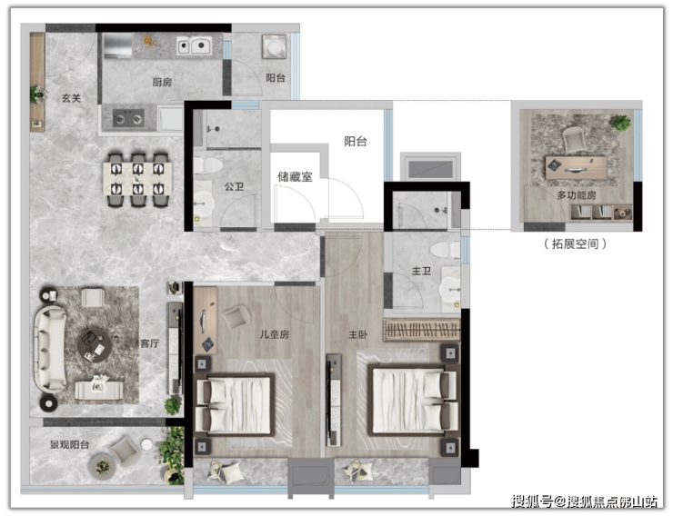 户型方面,建面约85㎡三房,经典的竖厅设计,动静分区明确。