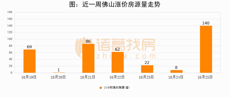 根据诸葛找房数据显示,佛山24小时涨价房源量为140套,较10月24日增加132套,环比上涨1650%。与此同时,涨价房源占比小幅扩大,业主信心有所提升。