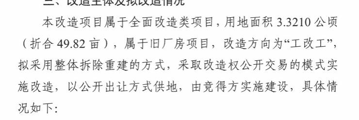 该项目属于全面改造类型,拟采用农村集体自行改造模式和“公开出让”的方式供应土地。