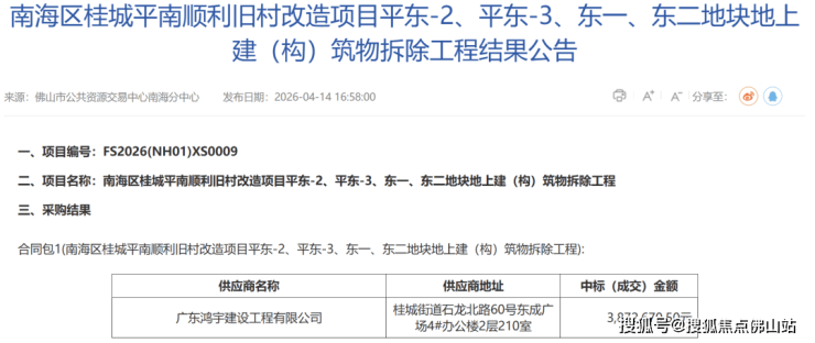桂城平南顺利旧村改造项目近期也发布了拆除工程结果公告,涉及平东-2、平东-3、东一、东二地块地上建(构)筑物。