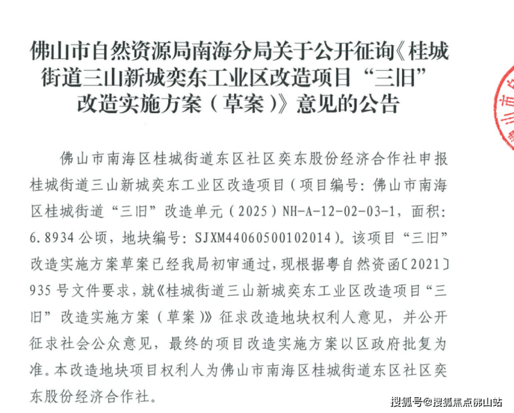 4月初,《桂城街道三山新城奕东工业区改造项目“三旧”改造实施方案(草案)》正式出炉。