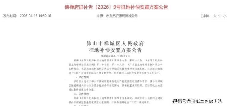 前几日,禅城区政府网站发布了《佛禅府征补告〔2026〕9号征地补偿安置方案公告》。