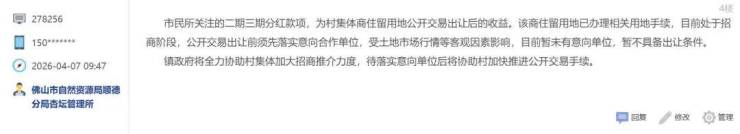 相关部门回复称:“二、三期分红款项,为村集体商住留用地公开交易出让后的收益。该商住留用地已办理相关用地手续,目前处于招商阶段,公开交易出让前须先落实意向合作单位,受土地市场行情等客观因素影响,目前暂未有意向单位,暂不具备出让条件。”